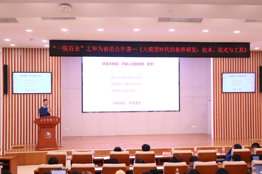 随着人工智能技术的不断发展,大模型已经成为当今科技领域的热点话题,不仅关乎技术的前沿,更关乎改变我们工作、生活和社会的方式。本次讲座主题为《大模型时代的软件研发:技术、范式与工具》,由华为云智能化软件研发首席专家、PaaS技术创新LAB主任、华为可信领域科学家、中国计算机学会软件工程专委副主任王千祥主讲。华为京津东北地区校招总监秦明坤,华为云计算技术专家朱留川,学院副院长(主持工作)王尚广、党委副书记张艺出席活动。活动旨在帮助学生对大模型研发领域的发展现状和未来方向有更加清晰的认识,启发学生对大模型时代软件研发的认知和理解,吸引了全院300余名师生到场参加。